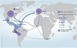 As a result, the global cocaine trade operates through a distinct illicit supply chain shaped by geography and economics. Production begins in Latin America, where coca plants are cultivated and processed through several chemical stages: first into a crude extract known as cocaine paste, then into coca base, and finally refined into cocaine hydrochloride. Occasionally, cocaine is adulterated with levamisole prior to shipment, both to increase bulk and to maximize profits for traffickers.[30] The drug is then trafficked-often across international borders-using a variety of smuggling routes and methods.