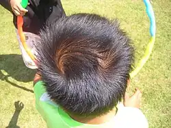 A cowlick is a section of human hair that stands straight up or lies at an angle at odds with the style in which the rest of an individual's hair is worn.[1][2]