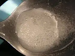 Crack cocaine is usually heated in a drug pipe until sublimation occurs at a relatively low temperature (about 90°C) and the vapor is inhaled.[5][24][25] This process is commonly referred to as "freebasing." Although commonly called "smoking," this method actually involves vaporizing the drug rather than burning it. If crack cocaine is burned directly, such as in a regular tobacco pipe, roll-your-own cigarette, or aluminum foil[26] higher temperatures may lead to decomposition of the active compound, reducing its effectiveness. This is why vaporization at lower temperatures, rather than combustion, is the preferred method for administration. While no formal studies have specifically quantified the extent of drug loss during combustion, users commonly choose to vaporize crack cocaine in order to maximize its effects and potentially avoid wasting money. Additionally, vaporizing is generally considered less harsh on the throat and lungs compared to smoking crack through a tobacco pipe, as combustion can produce more irritating and toxic by-products.