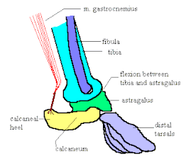 The ankle joint of therian mammals (marsupials and placentals) is a crurotarsal joint, with the main joint of ankle bending between the tibia and the astragalus; the calcaneum has no contact with the tibia but forms a heel to which muscles can attach.