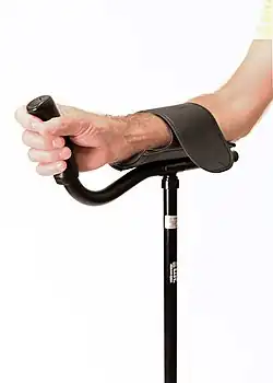 These are less common and used by those with poor hand or grip strength due to arthritis, cerebral palsy, or other conditions. The forearm rests on a horizontal platform and is usually strapped in place with velcro-type straps that allow the platform or trough to release in case of a fall. The hand holds an angled grip which, in addition, should allow adjustment of length from trough to grip and side-to-side sway depending on the user's disability.
