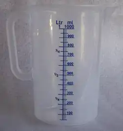 ![]() A measuring cup holding 1000 cubic centimetres, that is one litre (1 L) or 1000 millilitres (1000 mL) | |