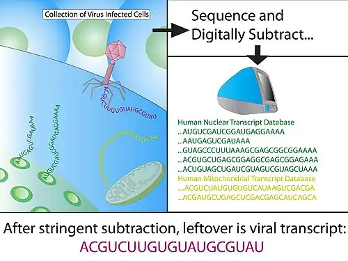 Digital transcriptome subtraction (DTS) is a bioinformatics method to detect the presence of novel pathogen transcripts through computational removal of the host sequences. DTS is the direct in silico analogue of the wet-lab approach representational difference analysis (RDA), and is made possible by unbiased high-throughput sequencing and the availability of a high-quality, annotated reference genome of the host. The method specifically examines the etiological agent of infectious diseases and is best known for discovering Merkel cell polyomavirus, the suspect causative agent in Merkel-cell carcinoma.[1]