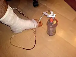 A surgical drain is a tube used to remove pus, blood or other fluids from a wound,[1] body cavity, or organ. They are commonly placed by surgeons or interventional radiologists after procedures or some types of injuries, but they can also be used as an intervention for decompression. There are several types of drains, and selection of which to use often depends on the placement site and how long the drain is needed.