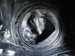 Adjustable valves can be pre-set or set to suit the undergarments during or after the descent, and in most situations can be left at this setting throughout the dive, but may be closed after surfacing to retain more gas for buoyancy and insulation,[41][42][1] An auto-dump valve is a two stage valve to reduce inward leakage of water. The inner valve is generally a mushroom type elastomer non-return valve, with a low opening pressure differential, which will close automatically when there is no suit gas flowing out. This serves to prevent water ingress when the valve is manually opened by pressing down on the outer cover to compress the adjustable spring and open the pressure relief valve. The outer valve is an adjustable pressure relief valve which can be manually opened by pressing it with the hand against the spring preload, or opens automatically when internal pressure overcomes the preload setting. Spring tension is adjusted by screwing the outer cover further down to increase opening pressure difference, and unscrewing to reduce pressure difference. The rotation of the cover has stops at both ends, and clicks every few degrees of turn, so the user can judge the setting. Non-adjustable valves are similar but do not have the adjustment facility and can be more compact. Most dry suit dump valves are manufactured by Apeks and SI Tech and may be relabeled by suit manufacturers, though Northern Divers and Mares manufacture their own valves.The SI Tech valve has a different size gasket to the Apeks glued to the suit, so they are not interchangeable.[40][43] Maintenance is mostly rinsing in fresh water after a dive, and most minor leaks can be fixed by soaking the valve mechanism and flushing with fresh water.[44]