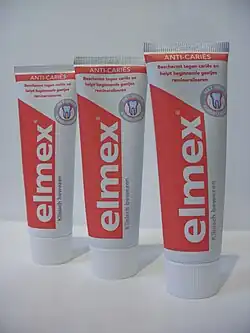 Elmex is a brand of toothpaste that has been sold since 1962.[1] It is manufactured by GABA International AG, a Swiss manufacturer of branded oral care products located in Therwil. GABA was acquired by the Colgate-Palmolive company of the United States in 2004 for US$841 million.[2] Elmex was the first toothpaste to contain the organic Amine Fluoride (AmF) olaflur as an active ingredient for protection against dental caries. Elmex is often sold together with Aronal which should be used in the morning.[3] Aronal contains vitamin A and zinc to protect the gums against inflammation.