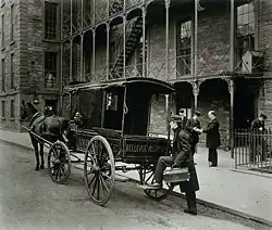 The first known hospital-based ambulance service operated out of Commercial Hospital, Cincinnati, Ohio (now the Cincinnati General) by 1865.[17][15] This was soon followed by other services, notably the New York service provided out of Bellevue Hospital which started in 1869 with ambulances carrying medical equipment,[18] such as splints, a stomach pump, morphine, and brandy, reflecting contemporary medicine.