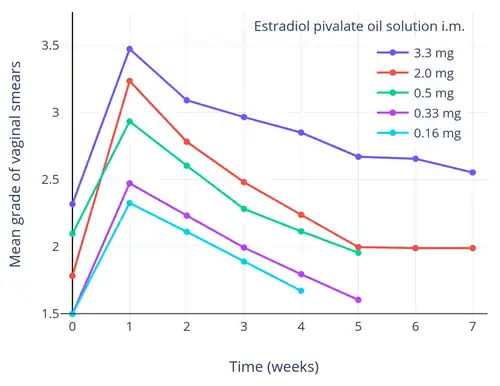 The duration of biological effect of estradiol pivalate in women has been studied.[10] It has been found to stimulate the vaginal epithelium in postmenopausal women, with a minimally effective dose of 0.16 mg and a maximally effective dose of 0.5 mg, both by intramuscular injection.[10] Its effect lasted for about 4 weeks at a dose of 0.16 mg and for more than 7 weeks at a dose of 3.3 mg.[10]