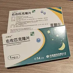 Common side effects include headache, dry mouth, nausea, and dizziness.[4] Severe side effects may include suicidal thoughts, hallucinations, and angioedema.[4] Rapid decreasing of the dose may result in withdrawal.[4] Eszopiclone is classified as a nonbenzodiazepine or Z-drug and a sedative and hypnotic of the cyclopyrrolone group.[6] It is the S-stereoisomer of zopiclone.[4][7]