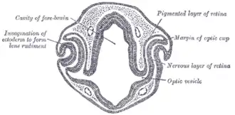 Eye development is initiated by the master control gene PAX6, a homeobox gene with known homologues in humans (aniridia), mice (small eye), and Drosophila (eyeless). The PAX6 gene locus is a transcription factor for the various genes and growth factors involved in eye formation.[1][5] Eye morphogenesis begins with the evagination, or outgrowth, of the optic grooves or sulci. These two grooves in the neural folds transform into optic vesicles with the closure of the neural tube.[6] The optic vesicles then develop into the optic cup with the inner layer forming the retina and the outer portion forming the retinal pigment epithelium. The middle portion of the optic cup develops into the ciliary body and iris.[7] During the invagination of the optic cup, the ectoderm begins to thicken and form the lens placode, which eventually separates from the ectoderm to form the lens vesicle at the open end of the optic cup.[1][3][4]