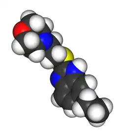 Fabomotizole (INN;[1] brand name Afobazole) is an anxiolytic drug launched in Russia in the early 2000s. It produces anxiolytic and neuroprotective effects without any sedative or muscle relaxant actions. Its mechanism of action remains poorly defined however, with GABAergic, NGF- and BDNF-release-promoting, MT1 receptor agonism, MT3 receptor antagonism, and sigma agonism suggested as potential mechanisms. Fabomotizole was shown to inhibit MAO-A reversibly and there might be also some involvement with serotonin receptors.[2][3][4][5][6] Clinical trials have shown fabomotizole to be well tolerated and reasonably effective for the treatment of anxiety.[7]
