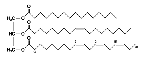 The term often refers specifically to triglycerides (triple esters of glycerol), that are the main components of vegetable oils and of fatty tissue in animals;[2] or, even more narrowly, to triglycerides that are solid or semisolid at room temperature, thus excluding oils. The term may also be used more broadly as a synonym of lipid—any substance of biological relevance, composed of carbon, hydrogen, or oxygen, that is insoluble in water but soluble in non-polar solvents.[1] In this sense, besides the triglycerides, the term would include several other types of compounds like mono- and diglycerides, phospholipids (such as lecithin), sterols (such as cholesterol), waxes (such as beeswax),[1] and free fatty acids, which are usually present in human diet in smaller amounts.[2]