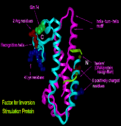 Fis was first discovered for its role in stimulating Gin catalyzed inversion of the G segment of phage Mu genome.[1] Fis was originally identified as the factor for inversion stimulation of the homologous Hin and Gin site-specific DNA recombinases of Salmonella and phage Mu, respectively. This small, basic, DNA-bending protein has recently been shown to function in many other reactions including phage lambda site-specific recombination, transcriptional activation of rRNA and tRNA operons, repression of its own synthesis, and oriC-directed DNA replication. Cellular concentrations of Fis vary tremendously under different growth conditions which may have important regulatory implications for the physiological role of Fis in these different reactions.[2]