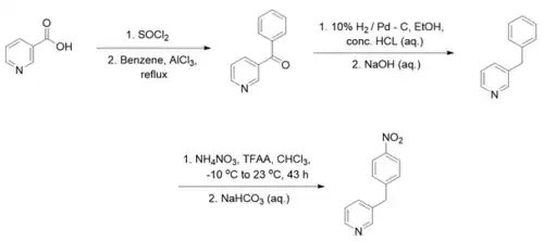 The starting material, 3-(4-nitrobenzyl)pyridine (1), is commercially available but can also be synthesised from the pyridine-derivative nicotinic acid, as shown in Figure 2. In the first step, nicotinic acid is chlorinated with SOCl3 after which a Friedel-Crafts acylation is performed to form 3-benzoyl pyridine.[3] This compound is reduced using hydrogen gas in combination with a palladium catalyst, creating 3-benzylpyridine.[4] 3-Benzylpyridine can be converted to 3-(4-nitrobenzyl)pyridine using ammonium nitrate and trifluoroacetic anhydride (TFAA) in chloroform.[4] Various intermediate compounds are commercially available, or can be synthesised in multiple ways, but a complete synthetic proposal was made to indicate the synthetic options.