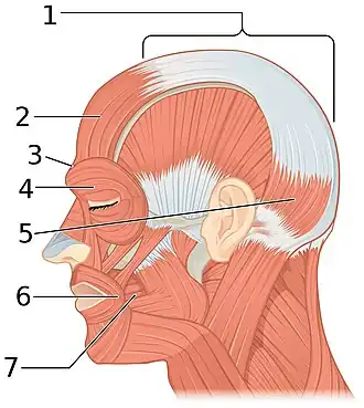 ![]() Muscles of the head, face, and neck. (Epicranial aponeurosis visible at top labeled 1.) | |
