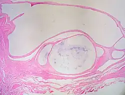 The exact cause is unknown.[9] The most commonly accepted probable cause of ganglion cysts is the herniation hypothesis, by which they are thought to occur as an out-pouching or distention of a weakened portion of a joint capsule or tendon sheath. This description is based on the observations that the cysts occur close to tendons and joints. The microscopic anatomy of the cyst resembles that of tenosynovial tissue. The fluid is similar in composition to synovial fluid. Dye injected into the joint frequently ends up in the cyst. Dye injected into the cyst rarely enters the joint, however, which has been attributed to the apparent formation of an effective and one-way "check valve", allowing fluid out of the joint, but not back in.[6]