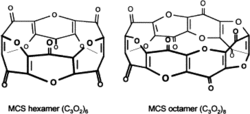 Carbon suboxide, C3O2, can be produced in small amounts in any biochemical process that normally produces carbon monoxide, CO, for example, during heme oxidation by heme oxygenase-1. It can also be formed from malonic acid. It has been shown that carbon suboxide in an organism can quickly polymerize into macrocyclic polycarbon structures with the common formula (C3O2)n (mostly (C3O2)6 and (C3O2)8), and that those macrocyclic compounds are potent inhibitors of Na+/K+-ATP-ase and Ca-dependent ATP-ase, and have digoxin-like physiological properties and natriuretic and antihypertensive actions. Those macrocyclic carbon suboxide polymer compounds are thought to be endogenous digoxin-like regulators of Na+/K+-ATP-ases and Ca-dependent ATP-ases, and endogenous natriuretics and antihypertensives.[26][27][28] Other than that, some authors think also that those macrocyclic compounds of carbon suboxide can possibly diminish free radical formation and oxidative stress and play a role in endogenous anticancer protective mechanisms, for example in the retina.[29]