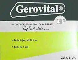 - ^ a b c d Perls T (June 2013). "The reappearance of procaine hydrochloride (Gerovital H3) for antiaging". J Am Geriatr Soc. 61 (6): 1024–5. doi:10.1111/jgs.12278. PMID 23772727. S2CID 41813351.