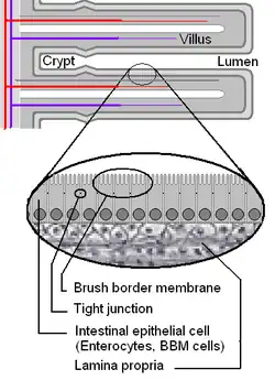 Some alpha gliadin have other direct-acting properties. Other gliadin peptides, one in a glutamine rich region and another peptide, "QVLQQSTYQLLQELCCQHLW", bind a chemoattractant receptor, CXCR3. Gliadin binds to, blocks and displaces a factor, I-TAC, that binds this receptor.[2] In the process it recruits more CXCR3 receptor, increases MyD88 and zonulin expression.[1][9] The factor it displaces, I-TAC, is a T-cell attractant. This peptide may also be involved in increased risk for type 1 diabetes as zonulin production is also a factor.[10] This triggering of zonulin ultimately results in the degradation of tight junctions allowing large solutes, such as proteolytic resistant gliadin fragments to enter behind the brush border membrane cells.