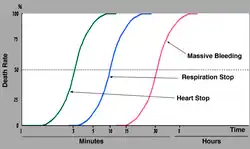 In emergency medicine, the golden hour is the period of time immediately after a traumatic injury during which there is the highest likelihood that prompt medical and surgical treatment will prevent death.[1][2] While initially defined as an hour, the exact time period depends on the nature of the injury and can be more than or less than this duration.[2] It is well established that the person's chances of survival are greatest if they receive care within a short period of time after a severe injury; however, there is no evidence to suggest that survival rates drop off after 60 minutes. Some have come to use the term to refer to the core principle of rapid intervention in trauma cases, rather than the narrow meaning of a critical one-hour time period.