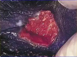 Granuloma inguinale is a bacterial disease caused by Klebsiella granulomatis (formerly known as Calymmatobacterium granulomatis)[1] characterized by genital ulcers.[2] It is endemic in many less-developed regions. It is also known as donovanosis,[3] granuloma genitoinguinale,[3] granuloma inguinale tropicum,[3] granuloma venereum,[4] granuloma venereum genitoinguinale,[3] lupoid form of groin ulceration,[3] serpiginous ulceration of the groin,[3] ulcerating granuloma of the pudendum,[3] and ulcerating sclerosing granuloma. Oral manifestations are also notably seen. The lesions of oral cavity are usually secondary to active genital lesions.