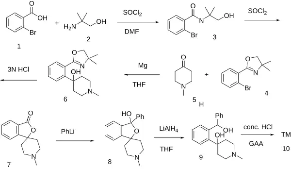 - ^ Klioze SS, Bauer VJ, Geyer HM (April 1977). "Synthesis of spiro[isobenzofuran-1(3H),4'-piperidines] as potential central nervous system agents. 2. Compounds containing a heteroatom attached to nitrogen". Journal of Medicinal Chemistry. 20 (4): 610–612. doi:10.1021/jm00214a039. PMID 850252.