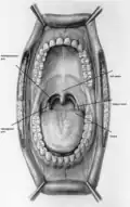 The oropharynx lies between the mouth (oral cavity) in the front and the laryngopharynx below, which separates it from the larynx. The upper limit of the oropharynx is marked by the soft palate and its lower limit by the epiglottis and root of the tongue. The oropharynx communicates with the mouth, in front through what is known as the oropharyngeal isthmus, or isthmus of the fauces. The isthmus (i.e., connection) is formed above by the soft palate, below by the posterior third of the tongue, and at the sides by the palatoglossal arches. The posterior third of the tongue or tongue base contains numerous follicles of lymphatic tissue that form the lingual tonsils. Adjacent to the tongue base, the lingual surface of the epiglottis, which curves forward, is attached to the tongue by median and lateral glossoepiglottic folds. The folds form small troughs known as the epiglottic valleculae. The lateral walls are marked by two vertical pillars on each side, the pillars of the fauces, or palatoglossal arches. More properly they are separately named the palatoglossal arch anteriorly and the palatopharyngeal arch posteriorly. The anterior arch is named from the palatoglossal muscle within, running from the soft palate to the tongue (glossus), while the posterior arch similarly contains the palatopharyngeal muscle running from the soft palate to the lateral pharynx. Between the arches lies a triangular space, the tonsillar fossa in which lies the palatine tonsil, another lymphoid organ. [32]