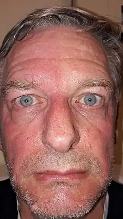 | A man exhibiting the asymmetric symptoms of Harlequin syndrome. One half of the forehead is more red than the other. | |