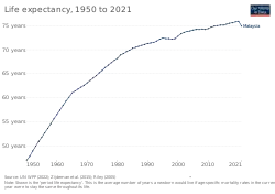 Malaysia has a widespread system of health care. It implements a universal healthcare system, which exists alongside the private healthcare system.[1] Infant mortality rate – a standard in determining the overall efficiency of healthcare – in 2005 was 10, comparing favourably with the United States and western Europe. Life expectancy at birth in 2005 was 74 years.[2] Infant mortality fell from 75 per 1000 live births in 1957 to 7 in 2013.[3]