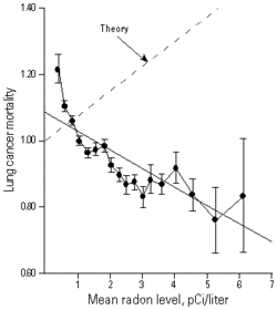 - ^ Cohen BL (1995). "Test of the linear-no threshold theory of radiation carcinogenesis for inhaled radon decay products" (PDF). Health Phys. 68 (2): 157–74. Bibcode:1995HeaPh..68..157C. doi:10.1097/00004032-199502000-00002. PMID 7814250. S2CID 41388715.