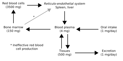 5. ^ Janet RH (June 2009). "Body iron excretion by healthy men and women". The American Journal of Clinical Nutrition. 89 (6): 1792–1798. doi:10.3945/ajcn.2009.27439. PMID 19386738.