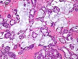 A histopathologic diagnosis of prostate cancer is the discernment of whether there is a cancer in the prostate, as well as specifying any subdiagnosis of prostate cancer if possible. The histopathologic subdiagnosis of prostate cancer has implications for the possibility and methodology of any subsequent Gleason scoring.[1] The most common histopathological subdiagnosis of prostate cancer is acinar adenocarcinoma, constituting 93% of prostate cancers.[2] The most common form of acinar adenocarcinoma, in turn, is "adenocarcinoma, not otherwise specified", also termed conventional, or usual acinar adenocarcinoma.[3]