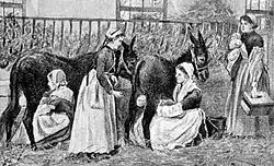 Mother's milk was considered best for babies, but the quality of the breastmilk was found to be varied. The quality of breastmilk was considered good only if the mother had a good diet, had physical exercise and was mentally in balance.[20] In Europe (especially in France) and less in the USA it was a practice among the higher and middle class to hire a wet nurse. If it was too difficult to find a wet nurse, people used formula to feed their babies, but this was considered very dangerous for the health and life of the baby.[21]