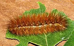 The range of plants on which a herbivorous insect feeds is known as its host range. This can be wide or narrow, but it never includes all plants. A small number of insects are monophagous, feeding on a single plant. The silkworm larva is one of these, with mulberry leaves being the only food consumed. More often, an insect with a limited host range is oligophagous, being restricted to a few closely related species, usually in the same plant family.[15] The diamondback moth is an example of this, feeding exclusively on brassicas,[16] and the larva of the potato tuber moth feeds on potatoes, tomatoes and tobacco, all members of the same plant family, Solanaceae.[17] Herbivorous insects with a wide range of hosts in various different plant families are known as polyphagous. One example is the buff ermine moth whose larvae feed on alder, mint, plantain, oak, rhubarb, currant, blackberry, dock, ragwort, nettle and honeysuckle.[18]