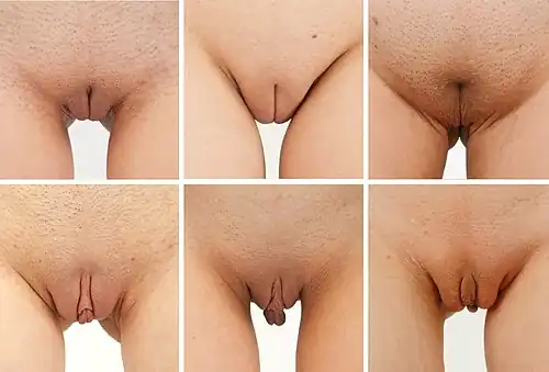 There is a great deal of variation in the appearance of the vulva.[11] Much of this variation lies in the significant differences in the size, shape, and color of the labia minora. Though called the smaller lips, they can often be of considerable size and may protrude outside the labia majora.[11][7] This variation has also been evidenced in a large display of 400 vulval casts called the Great Wall of Vagina created by Jamie McCartney to fill the lack of information of what a normal vulva looks like. The casts taken from a large and varied group of women showed clearly that there is much variation.[34][11] Other variations of the vulva include the appearance of Fordyce spots and clitoral phimosis (when the clitoral hood cannot retract past the glans).