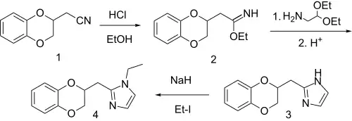 The imidazole portion of imiloxan is prepared by the reaction of an imidate with the diethyl acetal of aminoacetaldehyde. N-Alkylation of the imidazole with ethyl iodide gives imiloxan.