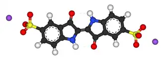 Indigo carmine, or 5,5′-indigodisulfonic acid sodium salt, is an organic salt derived from indigo by aromatic sulfonation, which renders the compound soluble in water. Like indigo, it produces a blue color, and is used in food and other consumables, cosmetics, and as a medical contrast agent and staining agent; it also acts as a pH indicator. It is approved for human consumption in the United States and European Union.[3][4] It has the E number E132, and is named Blue No. 2 by the US Federal Food, Drug, and Cosmetic Act.[5]