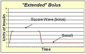 An extended bolus is a slow infusion of insulin spread out over time. By pumping with a "square wave" shape, the bolus avoids a high initial dose of insulin that may enter the blood and cause low blood sugar before digestion can facilitate sugar entering the blood. The extended bolus also extends the action of insulin well beyond that of the insulin alone. The extended bolus is appropriate when covering high fat high protein meals such as steak, which will be raising blood sugar for many hours past the onset of the bolus. The extended bolus is also useful for those with slow digestion (such as with gastroparesis or coeliac disease).