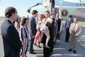 President Ronald Reagan meets Katie Beckett, along with her parents, Julie and Mark Beckett as the President exits Air Force One on the tarmac of Cedar Rapids Municipal Airport, Iowa, 20 September 1984. Photograph by official White House photographer Michael Evans, courtesy of the Ronald Reagan Presidential Library.