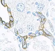 | Keratin (high molecular weight) in bile duct cell and oval cells of mouse liver. | |