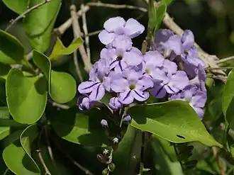 | Duranta erecta | golden dewdrop, pigeon berry, skyflower | Verbenaceae | The leaves and berries of the plant are toxic and are confirmed to have killed children, dogs, and cats.[112] |