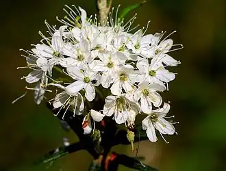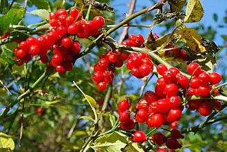 | Daphne spp. | daphne, garland flower, mezereum, spurge laurel | Thymelaeaceae | All parts of all species in this genus, especially the berries (variously red, yellow, blue, or black), are highly toxic, the primary active principle being the glycoside daphnin; some species also contain mezerein. Ingestion of even just a few berries can produce a burning sensation in the mouth, severe abdominal pain, vomiting, bloody diarrhea, weakness, stupor, and convulsions, followed by coma; it is often fatal.[100] Corrosive lesions of the oral mucosa and upper gastrointestinal tract may also occur, and nephritis has been reported.[100] The sap and berry juice may cause allergic dermatitis in sensitive individuals.[101] | |