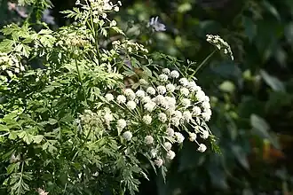 | Cicuta spp. | water hemlock, cowbane, wild carrot, snakeweed, poison parsnip, false parsley, children's bane, death-of-man | Apiaceae | The root, when freshly pulled out of the ground, is extremely poisonous and contains cicutoxin, a central nervous system stimulant that induces seizures. When dried, the poisonous effect is reduced. The most common species is C. maculata; one of the species found in the Western United States, C. douglasii, often found in pastures and swamps, has especially thick stems and very large and sturdy flowers which are sometimes harvested for flower displays. This is inadvisable as the sap is also toxic. | |