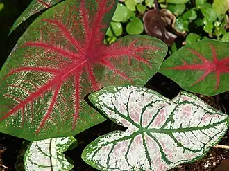 | Caladium spp. | angel wings, elephant ear, heart of Jesus | Araceae | All parts of all plants in this genus contain insoluble calcium oxalate crystals, which are toxic. Symptoms of ingestion generally include irritation and burning of the mouth, lips, and throat, nausea and vomiting, abdominal pain, diarrhea, muscle twitching, and sometimes swelling of the mouth or tongue, which can cause breathing to become fatally blocked. In severe cases chronic kidney disease or renal failure can occur.[71] They are poisonous to dogs and cats as well as humans.[72] |
