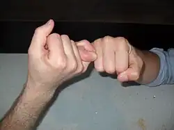 Among American children, a "pinky swear" or "pinky promise" is made when a person wraps one of their pinky fingers around another person's pinky and makes a promise.[6] Something similar is also seen in China and Korea, where people link their pinky fingers and then stamp their thumbs together to make a yaksok (promise).