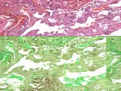 Microscopic examination of biopsy specimens reveals an increase in both the size and number of thin walled lymphatic channels along with lymphatic spaces that are interconnecting and dilated, lined by a single attenuated layer of endothelial cells involving the dermis, subcutis, and possibly underlying fascia and skeletal muscle.[3] Additionally, Tazelaar, et al., described a pattern of histological features of lung specimens from nine patients in whom no extrathoracic lesions were identified, which they termed "diffuse pulmonary lymphangiomatosis" (DPL).[4]