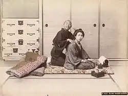 In ashiatsu, the practitioner uses their feet to deliver treatment. The name comes from the Japanese, ashi for foot and atsu for pressure.[55] This technique typically uses the heel, sesamoid, arch, and/or whole plantar surface of foot, and offers large compression, tension and shear forces with less pressure than an elbow and is ideal for large muscles, such as in thigh, or for long-duration upper trapezius compressions.[56] Other manual therapy techniques using the feet to provide treatment include Keralite, Barefoot Lomilomi, and Chavutti Thirumal.