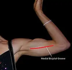 Picture of a flexed arm in medial view. Medial Bicipital Groove visible between postero-medial border of the short head of biceps brachii and anteromedial border of long head of triceps brachii