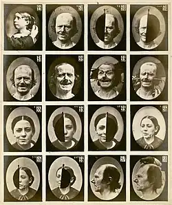 G.-B. Duchanne de Boulogne, Synoptic plate 4 from Le Mécanisme de la Physionomie Humaine. 1862, albumen print. In the upper row and the lower two rows, patients with different expressions on either side of their faces