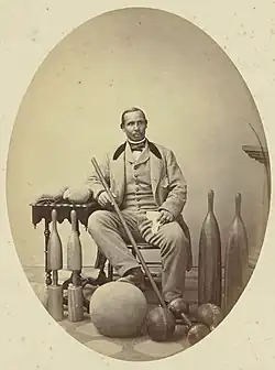 Hippocrates is said to have stuffed animal skins for patients to toss for medicinal purposes.[4] Similar large balls were said to have been used in Persia, specifically by Persian wrestlers, as well as by Gladiators.[4][5][6] The term "medicine ball" dates back to at least 1876, in American Gymnasia and Academic Record, by Robert Jenkins Roberts Jr. The first known photograph of a medicine ball in the United States was taken in 1866 and shows Harvard athletic instructor Aaron Molyneaux Hewlett surrounded by his equipment.[6][7]